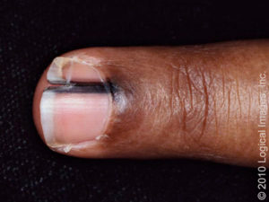 Harold presents with a central single strip in his fingernails,which has been there for 2 months after he hit his hand in the door. He has a history of sun exposure and says that perhaps he remembers it being there beforehand as well.