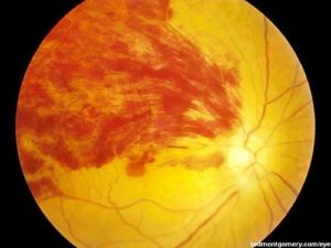 Geoff, 75, presents with sudden onset painless visual disturbance over 24 hours in his right eye which started on waking, on a background of poorly controlled T2DM and HTN, Hyperlipidaemia.  On examination VA is reduced to 6/60 and not improved with 1mm pinhole, you note a relative afferent pupillary defect.